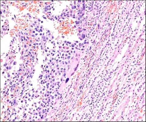 При посмертном гистологическом исследовании опухоль средостения и её метастазы имели солидное строение и состояли из атипичных синцитиотро-фобластов (крупные плеоморфные с насыщенной эозинофильной цитоплазмой и со множественными гиперхромными ядрами с различимыми ядрышками) и цитотрофобластов (полигональные клетки с круглыми ядрами, выраженными ядрышками и прозрачной или эозинофильной цитоплазмой) (рис. 2). Отмечалась высокая митотическая активность опухолевых клеток. Опухоль также имела многочисленные некро- зы. При тотальном гистологическом исследовании яичек патологических очагов не выявлено, паренхима обычного гистологического строения.