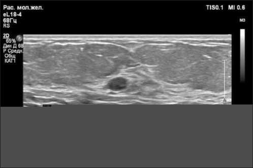 Объективно молочные железы симметричные, № 2, птоз I степени. Кожные покровы, сосковоареолярные комплексы с обеих сторон не изменены, выделений из сосков нет. В правой молочной железе на границе верхних квадрантов при глубокой пальпации нечетко определялась зона уплотнения, диаметром 1 см (расценено как непальпируемое образование), смещаемая по отношению к окружающим тканям, безболезненная при пальпации.