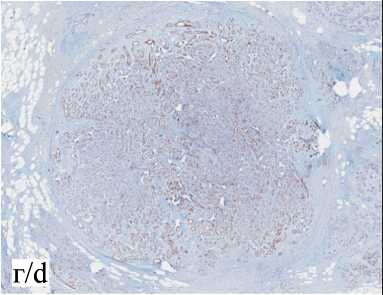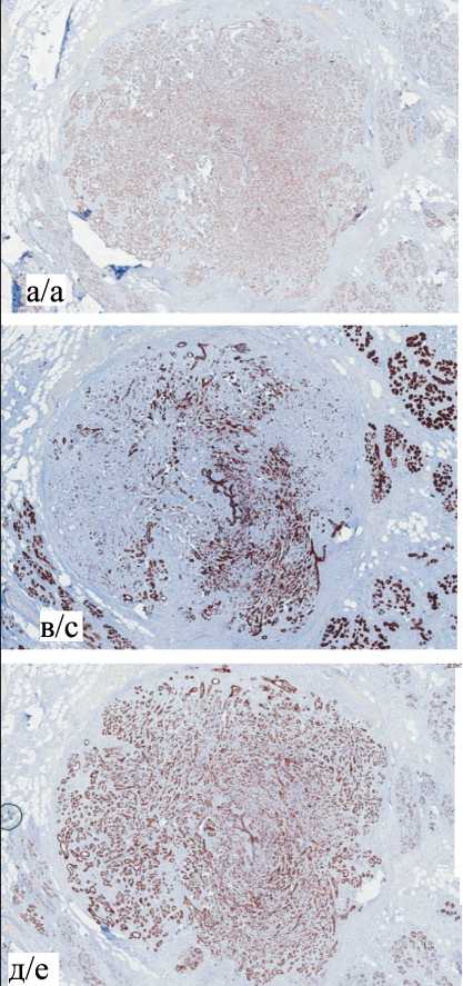 Результаты ИГХ-исследования: на периферии железистых структур, а также в окружающей клеточной строме отмечается выраженная ядер-ная экспрессия p63 (polyclonalCell Marque) (рис. 9а) и цитоплазматическая экспрессия Calponin-1(clone EP798Y Cell Marque) (рис. 9б), что демонстрирует наличие миоэпителиальных клеток. В железистых структурах отмечается выраженная диффузная