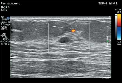 Рис. 1. УЗ-картина гипоэхогенного образования на границе верхних квадрантов правой молочной железы.