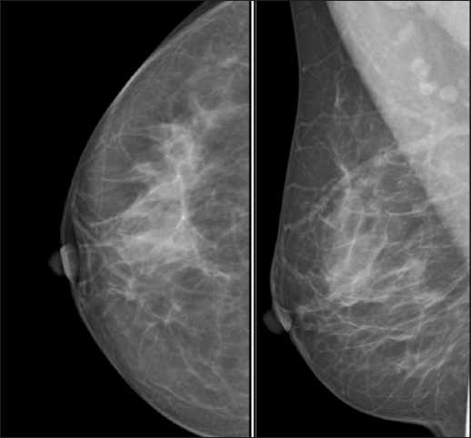 Обзорная маммография молочных желез в 2 проекциях через 4 мес после первичного обследования: в правой молочной железе визуализируются единичные мелкие тени кистозного характера, рассеянные кальцинаты. Отдельные узловые образования, зоны асимметрии строения и перестрой-