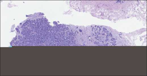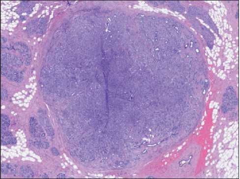 По данным патологоанатомического исследования трепан-биоптата опухоли определялись фрагменты молочной железы с нарушенной архитектоникой за счёт разрастания опухоли, состоящей из плотно расположенных клеток с округлыми и овальными гиперхромными ядрами и скудной цитоплазмой, окруженными гиперпластическими миоэпителиальными клетками. Митотическая активность не определяется. Опухолевые клетки формируют трабекулярные и тубулярные структуры. Строма опухоли умеренно выражена, с очаговым гиалинозом. Заключение: морфологи- ческая картина соответствует аденомиоэпителиоме молочной железы (рис. 4).