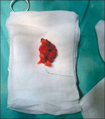 По данным прижизненного патологоанатомического исследования операционного материала: макроскопически – фрагмент жировой клетчатки, размерами 3×1×3,5 см, на разрезе – участок тяжистой фиброзной ткани, размера-