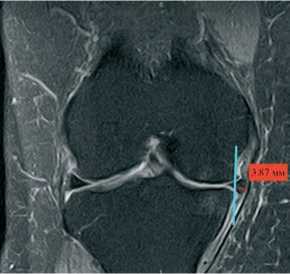 МРТ коленного сустава выполняли до операции и через 12 мес. после операции, оценивая экструзию прооперированного мениска в T2-режиме во фронтальной проекции от медиального края большеберцовой кости, не считая остеофит, до мениска в области его наибольшей его экструзии. (рис. 1) Данные исследования были выполнены на аппаратах мощностью не менее 1,5 Тесла. Экструзия мениска оценивалась одним специалистом по описанной выше методике.