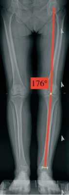 Пациенткам выполнена телерентгенография обеих нижних конечностей в положении стоя. На данных рентгенограммах определяли механическую ось нижней конечности и угол HKA (англ.: Hip-Knee-Ankle). Данный угол измеряется между двумя линиями которые проводятся от центра головки бедренной кости и центра блока таранной кости до центра коленного сустава. (рис. 2)