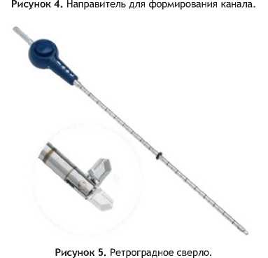 Для формирования канала использовали специальный направитель фирмы производителя Arthrex (рис.4), а также ретроградное сверло FlipCutter (рис.5), которое благодаря своей конструкции позволяло увеличить диаметр концевой части непосредственно в полости сустава и путем обратного рассверливания на 3–4 мм освежать зону инсерции корня для лучшего сращения и сформировать ложе для мениска.