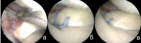 Рисунок 6. Этапы фиксации корня мениска: а) прошивание корня медиального мениска при помощи инструмента Knee Scorpion; б) прошитый мениск, нити погружены в ранее сформированный канал и выведены на наружный кортикальный слой большеберцовой кости; в) вид медиального мениска после фиксации и натяжения нитей на кортикальной пуговице