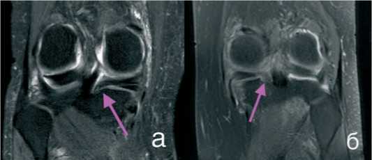 Рисунок 7. МРТ через 12 мес после операции: а) полное восстановление; б) частичное восстановление
