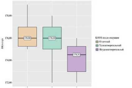 При анализе зависимости показателей KOOS после операции от угла НКА, были установлены статистически значимые различия (p=0,020) (используемый метод: Критерий Краскела – Уоллиса) (рис. 9).