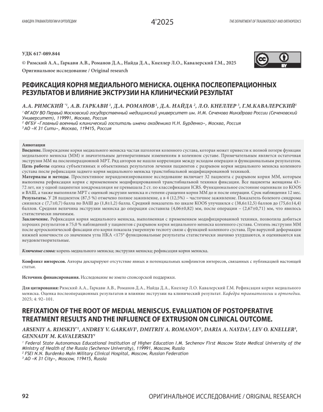 Среди разрывов медиального мениска, составляющих до 14 % от всех травм коленного сустава, около 30 % повреждений затрагивают его корень – область, располагающуюся в пределах 9 мм от костного прикрепления заднего рога внутреннего мениска к большеберцовой кости [1]. В последние годы к этой патологии проявляется всё больший клинический интерес, при повреждении корня медиального мениска (ПКММ) нарушается анатомическая целостность полукольца мениска что приводит к полной потери его функции [2].