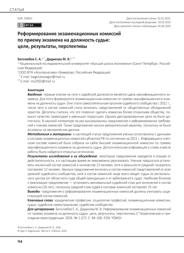 Introduction: The first stage on the way to a judicial position is passing a qualification exam. For this purpose, examination commissions are formed for the admission of the qualification exam for the position of judge. They became an independent body of the judicial community in 2011, after which the commissions began to include representatives from public associations of lawyers. The deputies believed that this would make the commissions more open to society, improve the quality of justice and reduce corruption. However, the declared goals were not achieved. Proposals have been repeatedly made in the scientific literature to reform the requirements for members of commissions. Such proposals were speculative in nature, as they were not based on empirical evidence. Methodology and materials: In this article, the scientists’ proposals are compared with data on the composition of the examination commissions of the subjects of the Russian Federation as of 2021. Information on the membership of the commissions was collected on the website of the Higher Examination Commission for the admission of the qualification exam for the position of judge. Additional information about the length of service and place of work was found in open sources. Research results and their discussion: Some proposals are in isolation from reality and are impossible to implement at the moment. The scientists proposed to establish the numerical composition of the commissions in the number of 13 people, although in reality their average figure is 12 people. There have been proposals to include representatives from all levels of the judicial community in the commissions, although the commissions most often include judges from the regional center (from the regional court of general jurisdiction and from the arbitration court). The closest proposal to implementation is to establish a minimum judicial length of service for inclusion in the commission (10 years), since the average length of service of judges in the commissions is 15 years. Conclusions: Proposals to reform the examination boards should take into account the existing composition of the commissions.
