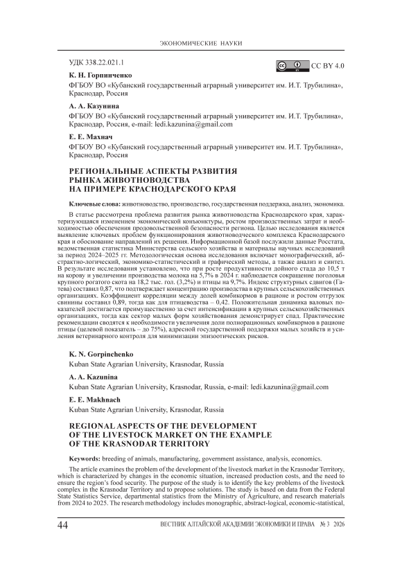 The article examines the problem of the development of the livestock market in the Krasnodar Territory, which is characterized by changes in the economic situation, increased production costs, and the need to ensure the region’s food security. The purpose of the study is to identify the key problems of the livestock complex in the Krasnodar Territory and to propose solutions. The study is based on data from the Federal State Statistics Service, departmental statistics from the Ministry of Agriculture, and research materials from 2024 to 2025. The research methodology includes monographic, abstract-logical, economic-statistical, and graphical methods, as well as analysis and synthesis. As a result of the study, it was found that with an increase in the productivity of the dairy herd to 10.5 tons per cow and an increase in milk production by 5.7% in 2024, there was a decrease in the number of cattle by 18.2 thousand heads (3.2%) and poultry by 9.7%. The structural shift index (Gatev’s) was 0.87, which confirms the concentration of production in large agricultural organizations. The correlation coefficient between the share of compound feed in the diet and the growth of pork shipments was 0.89, while it was 0.42 for poultry farming. The positive dynamics of gross indicators are achieved mainly through intensification in large agricultural organizations, while the small-scale farming sector is experiencing a decline. The practical recommendations include increasing the share of complete feed in the poultry diet (the target is up to 75%), targeted government support for small farms, and strengthening veterinary control to minimize epizootic risks.