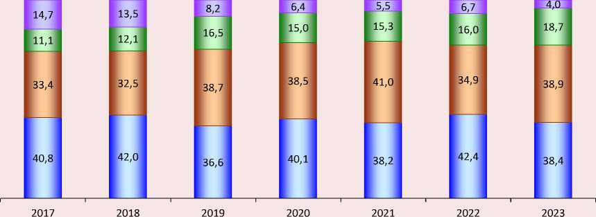 Регулярно Министерство труда и социальной защиты Российской Федерации помимо общего количества квот для регионов устанавливает перечень и количество профессиональноквалификационных групп для выдачи разрешений на работу ( рис. 6 ). Больше всего квот в 2024 году было выделено в таких профессионально-квалификационных группах, как другие профессии квалифицированных рабочих крупных и мелких промышленных предприятий (26% от общей доли профессиональноквалификационных групп), рабочие, занятые на горных, горно-капитальных и на строительно-монтажных и ремонтно-строительных работах (19,7%), операторы, аппаратчики, машинисты и слесари-сборщики стационарного оборудования (14,2%), рабочие металлообрабатывающей и машиностроительной промышленности (10,0%). Наименее представлены такие категории работников, как продавцы (1,0%), водители и машинисты подвижного оборудования (1,4%), операторы, аппаратчики и машинисты промышленных установок (1,5%). В целом распределение продемонстрировало, что даже несмотря на преобладание в структуре профессий «рабочих» специальностей, всё же это рабочие места, которые требуют квалификации и определенной специализации. В 2024 году наиболее выраженные тренды на увеличение квот наблюдались в таких профессионально-квалификационных группах, как другие профессии квалифицированных рабочих (на 105%, или на 20765 чел. по сравнению с 2017 годом), операторы, аппаратчики, машинисты и слесари-сборщики стационарного оборудования (на 65%, или на 8790 чел.), рабочие металлообрабатывающей и машиностроительной промышленности (на 44%, или на 4734 чел.). Причинами увеличения числа квот выступили отсутствие необходимых кадров в регионах, ввод импортного оборудования, а также необходимость привлечения дополнительной рабочей силы на крупные проекты, такие как строительство газопровода «Сила Сибири» и газоперерабаты-