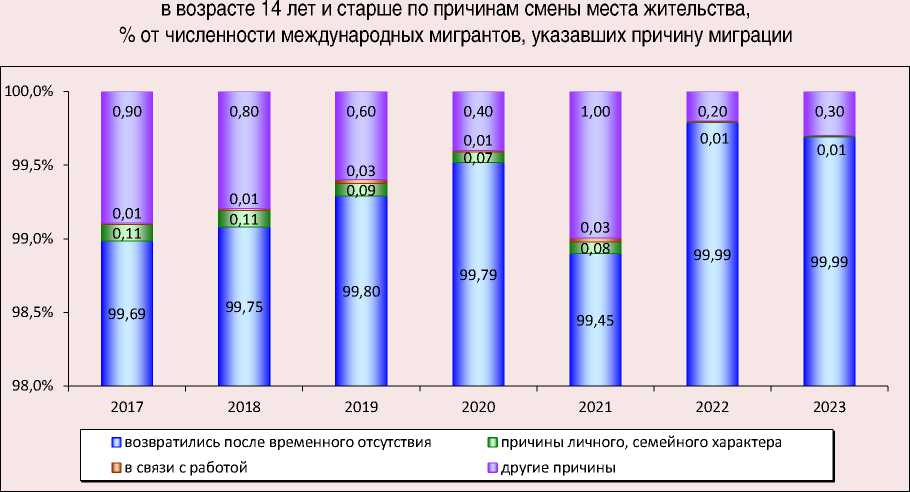 Структура выбытий иностранных мигрантов из РФ разительно отличается от структуры прибытий. В подавляющем большинстве случаев причиной отъезда становится возвращение после временного отсутствия, что подчеркивает временный характер пребывания граждан других государств на территории страны и вносит элемент нестабильности на отечественных рынках труда ( рис. 2 ).