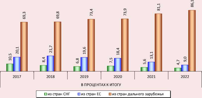 Наибольшая доля высококвалифицированных иностранных граждан, имевших действующее разрешение на работу, приходится на страны дальнего зарубежья ( рис. 4 ). Выраженное увеличение процентного соотношения специалистов из Китая (с 25,8 до 27,7%) и Турции (с 20,0 до 34,1%) за период 2017– 2022 гг. указывает на структурные изменения в составе мигрантов. Эти тенденции можно