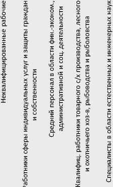приходятся на рабочих, занятых на горных, горно-капитальных, строительно-монтажных и ремонтно-строительных работах (30,6%) и иных профессионально-квалификационных групп (17,6%). Особенностью этих регионов является более высокая доля руководителей учреждений, организаций и предприятий и их структурных подразделений (9,9%, тогда как в других группах доля колеблется от 4,6 до 6,2%).