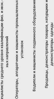 Другие квалифицированные рабочие промышленных предприятий (30,5%), рабочие, занятые на горных, горно-капитальных, строительно-монтажных и ремонтно-строительных работах (16,1%), и операторы, аппаратчики, машинисты и слесари-сборщики стационарного оборудования (7,9%) входят в тройку лидеров по значениям долей в 3-й группе регионов. Особенностью данной группы регионов является очень незначительная, но все же большая, чем в остальных группах субъектов, доля квот продавцов (2,4%, в остальных от 0 до 1,1%) и среднего персонала в области финансово-экономической, административной и социальной деятельности (8,8% против 1,8–2,0% соответственно).