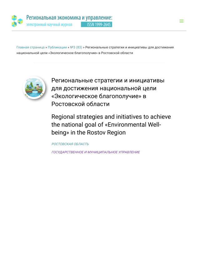 Национальная цель «Экологическое благополучие», утверждённая Указом Президента РФ от 07.05.2024 № 309, направлена на комплексное решение экологических проблем в России. Она включает формирование современной системы обращения с твёрдыми коммунальными отходами, улучшение качества атмосферного воздуха, устранение накопленного экологического вреда, охрану водных ресурсов, сохранение природных территорий и развитие экологического туризма. В статье анализируются ключевые направления этой цели на региональном уровне, с акцентом на Ростовскую область. Проведён SWOT-анализ экологического сектора региона, выявлены сильные и слабые стороны, возможности и угрозы. На основе анализа определена стратегическая цель — повышение экологической устойчивости региона — и сформулированы конкретные задачи по преодолению проблем, таких как загрязнение воздуха и водных объектов, неэффективное управление отходами. Предложены стратегические инициативы, включая развитие инфраструктуры для переработки отходов, мониторинг экологических показателей и поддержку зелёных технологий. Реализация этих мер позволит интегрировать экологические приоритеты в региональную стратегию социально-экономического развития, способствуя устойчивому росту и улучшению качества жизни населения.