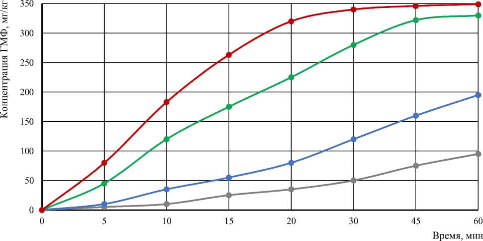 Рисунок 1 – Кинетика накопления гидроксиметилфурфурола (ГМФ) в моделируемой системе при различных температурах термообработки