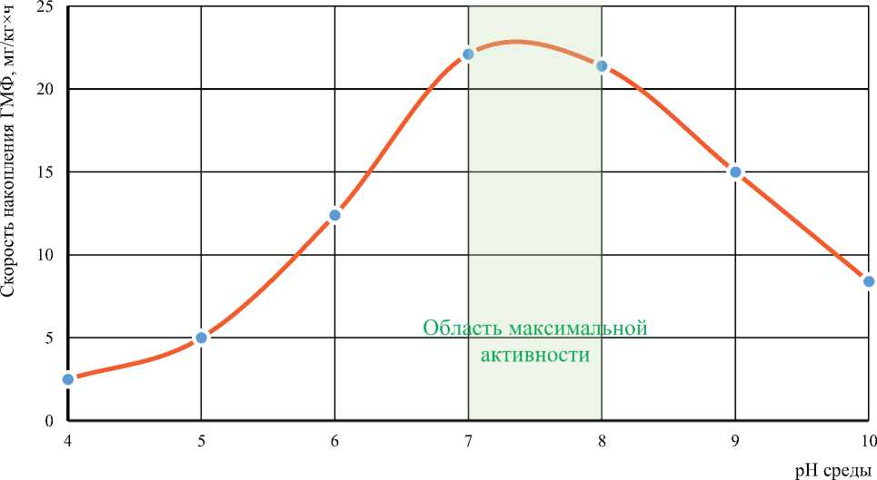 Рисунок 2 – Зависимость скорости накопления ГМФ (за 30 мин при 115 °C) от исходного значения pH среды