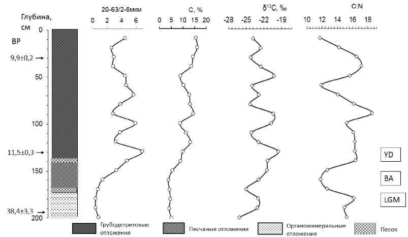 Вышележащий слой (190–180 см), вероятно, соответствует эпохе последнего ледникового оледенения плейстоцена (LGM). Значение соотношений фракций, равное 0,4, является самым низким во всей гранулометрической записи керна, что может указывать на длительный период ледового покрова. Как известно, ледовый покров подавляет развитие достаточно сильных течений в малых озерах, препятствуя переносу крупнозернистого материала [Asikainen et al., 2007]. Климат в этот период был холодным и сухим. Отношения C/N (16 и 15) указывают на отсутствие существенных изменений в источниках ОВ, которыми на протяжении всего периода оставалась преимущественно наземная (древесно-кустарниковая) растительность. Однако наблюдаются некоторое утяжеление δ¹³С (до –23 ‰) и снижение содержания Сорг. (в среднем 4,5 %), свидетельствующие о незначительном вкладе фитопланктона. Последний использует в метаболизме более тяжелый бикарбонат-ион (HCO₃⁻), что связано со снижением концентрации растворенного CO₂ в воде.