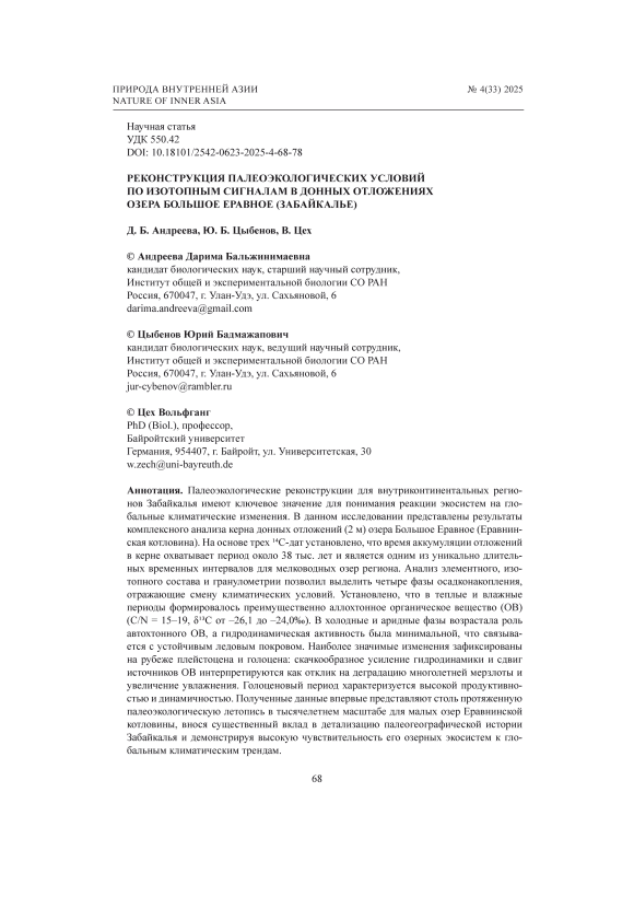 Палеоэкологические реконструкции для внутриконтинентальных регионов Забайкалья имеют ключевое значение для понимания реакции экосистем на глобальные климатические изменения. В данном исследовании представлены результаты комплексного анализа керна донных отложений (2 м) озера Большое Еравное (Еравнинская котловина). На основе трех ¹⁴C-дат установлено, что время аккумуляции отложений в керне охватывает период около 38 тыс. лет и является одним из уникально длительных временных интервалов для мелководных озер региона. Анализ элементного, изотопного состава и гранулометрии позволил выделить четыре фазы осадконакопления, отражающие смену климатических условий. Установлено, что в теплые и влажные периоды формировалось преимущественно аллохтонное органическое вещество (ОВ) (C/N = 15–19, δ¹³C от –26,1 до –24,0‰). В холодные и аридные фазы возрастала роль автохтонного ОВ, а гидродинамическая активность была минимальной, что связывается с устойчивым ледовым покровом. Наиболее значимые изменения зафиксированы на рубеже плейстоцена и голоцена: скачкообразное усиление гидродинамики и сдвиг источников ОВ интерпретируются как отклик на деградацию многолетней мерзлоты и увеличение увлажнения. Голоценовый период характеризуется высокой продуктивностью и динамичностью. Полученные данные впервые представляют столь протяженную палеоэкологическую летопись в тысячелетнем масштабе для малых озер Еравнинской котловины, внося существенный вклад в детализацию палеогеографической истории Забайкалья и демонстрируя высокую чувствительность его озерных экосистем к глобальным климатическим трендам.