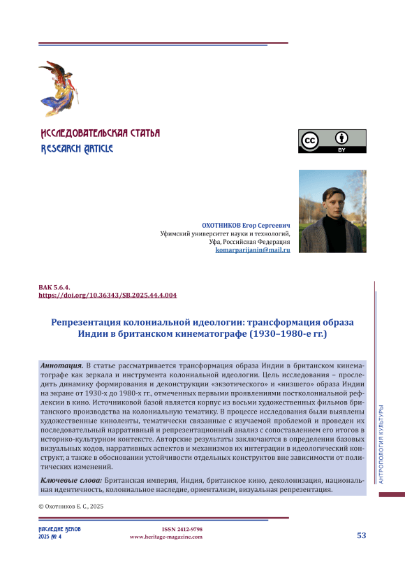 В статье рассматривается трансформация образа Индии в британском кинематографе как зеркала и инструмента колониальной идеологии. Цель исследования – проследить динамику формирования и деконструкции «экзотического» и «низшего» образа Индии на экране от 1930-х до 1980-х гг., отмеченных первыми проявлениями постколониальной рефлексии в кино. Источниковой базой является корпус из восьми художественных фильмов британского производства на колониальную тематику. В процессе исследования были выявлены художественные киноленты, тематически связанные с изучаемой проблемой и проведен их последовательный нарративный и репрезентационный анализ с сопоставлением его итогов в историко-культурном контексте. Авторские результаты заключаются в определении базовых визуальных кодов, нарративных аспектов и механизмов их интеграции в идеологический конструкт, а также в обосновании устойчивости отдельных конструктов вне зависимости от политических изменений.