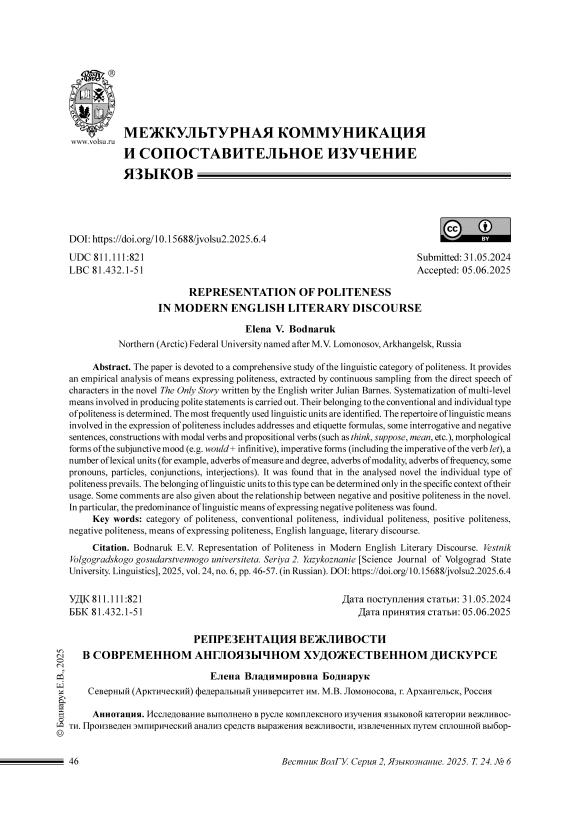 В статье рассмотрены разноуровневые языковые средства выражения вежливости, извлеченные методом сплошной выборки из прямой речи романа «The Only Story» английского писателя Дж. Барнса. В этом произведении конвенциональный тип вежливости (в оформлении которого участвуют обращения и этикетные формулы) количественно значительно уступает индивидуальному типу (представленному большинством остальных разноуровневых языковых средств). Репертуар языковых единиц, участвующих в оформлении веж- ливого высказывания, оказался весьма внушительным (всего было обнаружено 652 языковые единицы), среди которых следует отметить вопросительные и отрицательные структуры, разнообразные глагольные средства (в том числе модальные глаголы, формы сослагательного наклонения, императив), некоторые разряды наречий, структуры с существительными и прилагательными, местоимения, союзы, частицы и междометия. В высказывании данные языковые средства часто комбинируются, в результате чего происходит повышение степени вежливости. Результаты семантикопрагматического и количественного анализа инвентаря средств выражения вежливости в романе свидетельствуют о том, что около 2/3 из них составили языковые единицы, служащие смягчению высказывания, уменьшению степени его категоричности и, соответственно, выражающие обычно негативную вежливость (вежливость дистанцирования). Так называемая позитивная вежливость (вежливость сближения) представлена в романе в меньшей степени. В заключение отметим, что изучение категории вежливости может и должно быть продолжено. Перспективным видится сравнительно-сопоставительное исследование средств выражения вежливости (например, в английском и русском, английском и немецком языках), а также рассмотрение вежливости в диахроническом аспекте.