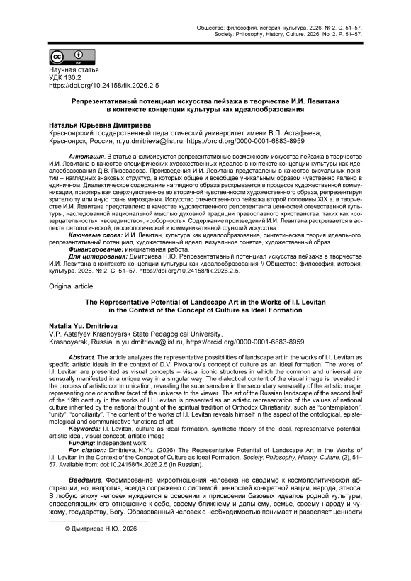 В статье анализируются репрезентативные возможности искусства пейзажа в творчестве И.И. Левитана в качестве специфических художественных идеалов в контексте концепции культуры как идеалообразования Д.В. Пивоварова. Произведения И.И. Левитана представлены в качестве визуальных понятий – наглядных знаковых структур, в которых общее и всеобщее уникальным образом чувственно явлено в единичном. Диалектическое содержание наглядного образа раскрывается в процессе художественной коммуникации, приоткрывая сверхчувственное во вторичной чувственности художественного образа, репрезентируя зрителю ту или иную грань мироздания. Искусство отечественного пейзажа второй половины XIX в. в творчестве И.И. Левитана представлено в качестве художественного репрезентанта ценностей отечественной культуры, наследованной национальной мыслью духовной традиции православного христианства, таких как «созерцательность», «всеединство», «соборность». Содержание произведений И.И. Левитана раскрывается в аспекте онтологической, гносеологической и коммуникативной функций искусства.