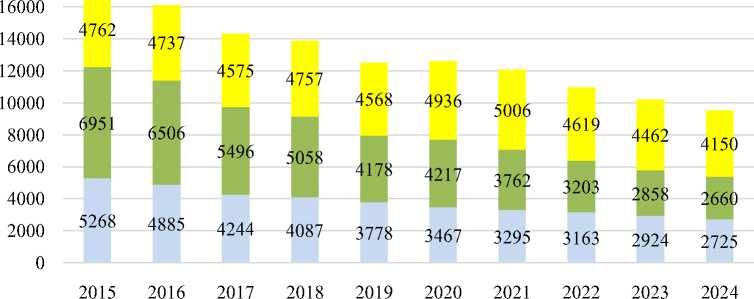 Количество родившихся первых детей сократилось с 5 268 в 2015 г. до 2 725 в 2024 г., т. е. практически в два раза произошло сокращение рождений первых детей. Количество родившихся вторых детей сократилось с 6 951 в 2015 г. до 2 660 в 2024 г., т. е. сокращение произошло в 2,6 раза. Количество родившихся третьих и последующих детей сократилось с 4 762 в 2015 г. до 4 150 в 2024 г., здесь сокращение не столь значительное (рис. 2). В результате таких сокращений в республике происходит общее снижение рождаемости.