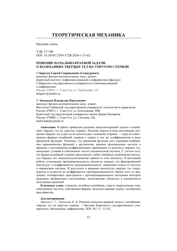 Стержни, балки, трубопроводы являются составными элементами многих конструкций в авиационной и космической технике, в водном и надводном транспорте, автомобильном и железнодорожном транспорте, зданиях и сооружениях, газонасосных и нефтепередающих станциях и т.п. Изгибные колебания таких элементов с получением частот и их форм колебаний изучены широко. В меньшей степени изучены колебания механических систем в виде этих элементов (стержней) с нагрузкой, закрепленной на них с помощью упругих связей. Наибольший практический интерес вызывает начально-краевая задача колебаний таких систем. В этом случае происходит перераспределение энергии между частями системы. В работах [1; 2] исследована такая задача, в которой смещение твердых тел раскладывается в ряд по их амплитудам, смещение стержня - в ряд по собственным формам колебаний стержня с одним и тем же коэффициентом в виде временной функции. После подстановки в гибридную систему дифференциальных уравнений и замены отношения второй производной от временной функции к самой временной функции на квадрат частоты со знаком минус, которое сводится к уравнению типа линейного осциллятора, получается несколько алгебраических, линейных относительно амплитуд твердых тел уравнений с коэффициентами, зависящими от частоты и параметров системы и одного уравнения четвертого порядка относитель -но форм колебаний. Решение линейного осциллятора есть линейная комбинация гармонических функций с аргументом, равным произведению частоты и времени с постоянными коэффициентами. Полученное соотношение ортогональности позволяет выразить неизвестные постоянные через амплитуды твердых тел и формы колебаний, частоты, параметров системы и начальных условий. В результате получено решение начальнокраевой задачи, в которое в явном виде входят амплитуды твердых тел.