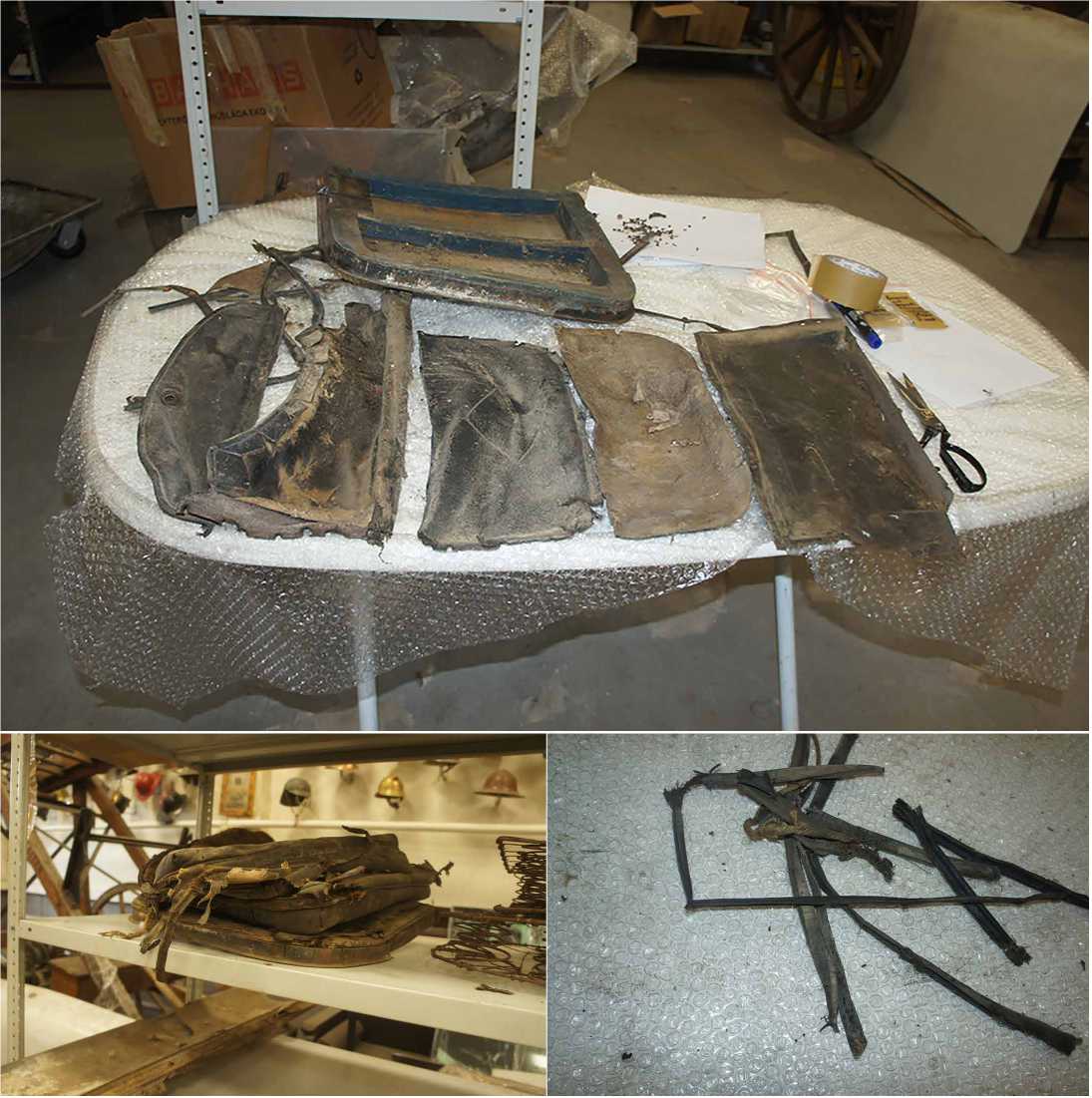 Покрытия с дверей салона полностью демонтированы. Кожаная обивка каждой из 3-х дверей состояла из 5 частей ( ил. 10 ). По состоянию сохранности она максимально приближена к археологической. Многие участки этих деталей сильно деформированы, а в некоторых местах деструктированы. Кожа полностью потеряла влагу и, соответственно, эластичность ( ил. 11 ). Обивка дверей очищена от пылевых и других загрязнений с помощью водно-спиртового раствора и далее, как в случае реставрации сидений, пропитана 1% раствором полиэтиленгликоля с молекулярным весом 1500 и жировой эмульсией (с последующим помещением ее в неглубокий вакуум).