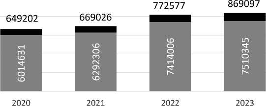 В целом по стране в 2020–2023 гг. численность прошедших обучение по программам ДПО (как в целом, так и по видам программ) устойчиво росла (Рисунок 1).