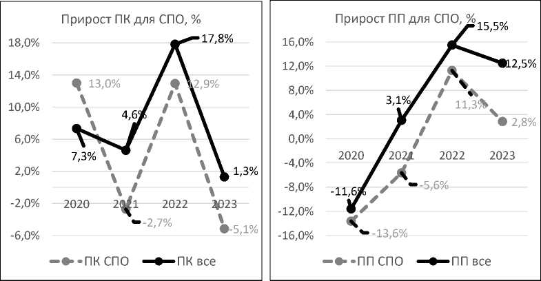 Еще одним новым сектором, который демонстрирует значимые изменения на рынке ДПО в стране, является обучение по программам ДПО слушателей, имеющих среднее профессиональное образование (СПО). Прежде всего отметим, что темпы роста численности слушателей со СПО, осваивающих программы ДПО, в 2020–2023 гг. ежегодно снижались, в отличие от темпов роста численности слушателей с образованием всех уровней, осваивавших все программы ДПО (Рисунок 6).