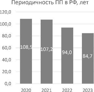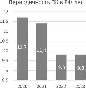 Рис.2. Периодичность обучения по программам ДПО (ПК – повышение квалификации, ПП – профессиональная переподготовка) в Российской Федерации в 2020–2023 гг. от числа занятых, лет