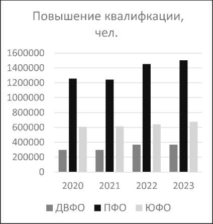 Рис. 14. Количество прошедших обучение по разным программам ДПО в ДВФО, ПФО и ЮФО) в 2020–2023 гг., чел.