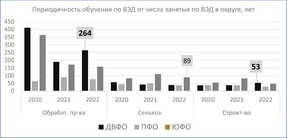 Рис. 16. Периодичность обучения по всем программам ДПО от числа занятых по ВЭД в округе для отраслей «Обрабатывающие производства», «Строительство» и «Сельское, лесное хозяйство, охота, рыболовство и рыбоводство» в 2020–2022 гг., лет