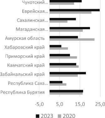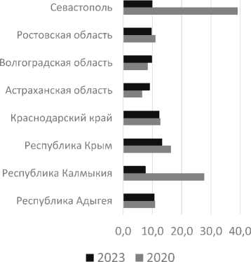 Fig. 18. Frequency of training for all additional professional education programs in the constituent entities of the Far Eastern, Volga and Southern Federal Districts in 2020 and 2023.