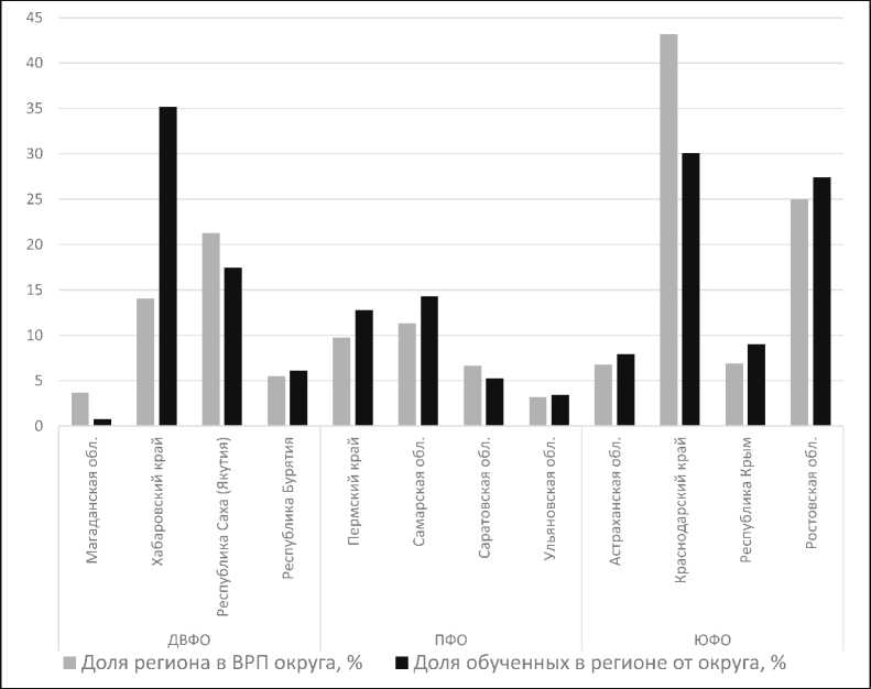 Рис. 19. Сравнение доли обученных в отдельных субъектах Федерации Дальневосточного, Приволжского и Южного федеральных округов от общего числа, обученных в каждом округе, и доли субъекта Федерации в ВРП округа в 2022 г., %