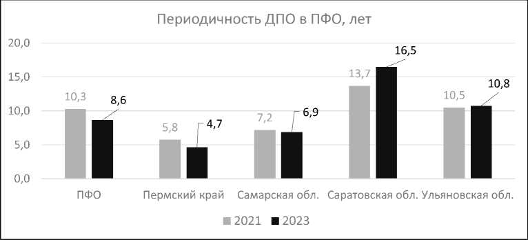 Рис. 12. Периодичность обучения по программам ДПО в Дальневосточном, Приволжском и Южном федеральных округах, рассчитанная по данным форм № 1-ПК и 1 кадры за 2020 г., лет