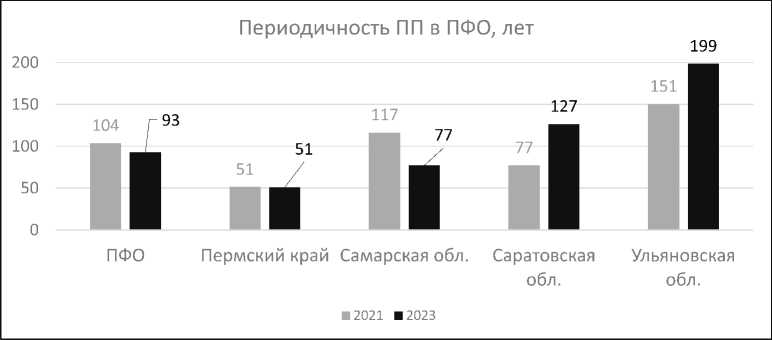 Рис. 20. Периодичность обучения по всем программам ДПО и программам профпереподготовки от числа занятых в отдельных субъектах Федерации Приволжского федерального округа в 2021 и 2023 гг., лет