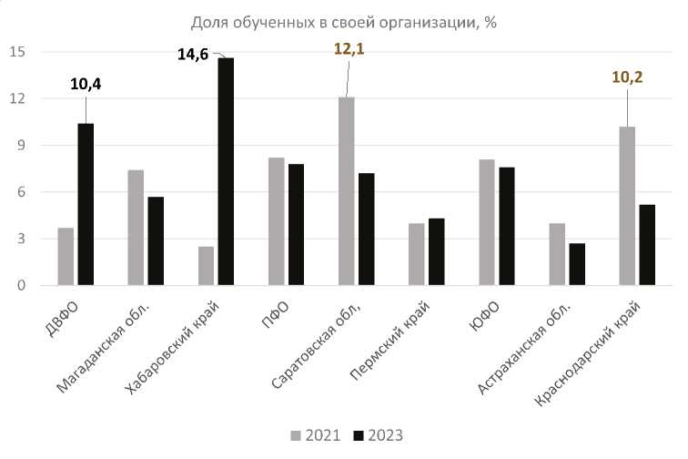 Fig. 21. The share of those trained in continuing education programs at enterprises from the total number of those trained in continuing education programs in the constituent entity of the federation in 2021 and 2023, %