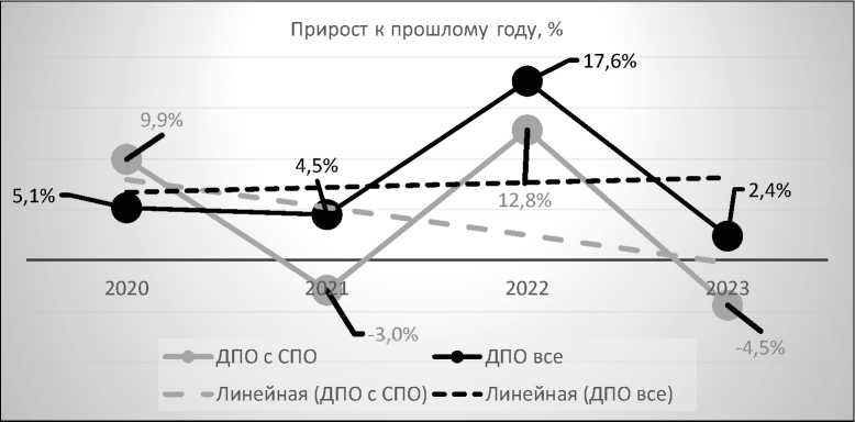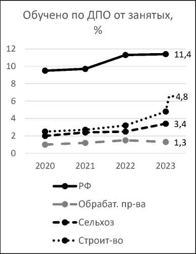 В 2020–2023 гг. проявился и значительно усилился новый тренд в ДПО – рост численности осваивающих программы ДПО на предприятии, где они работают