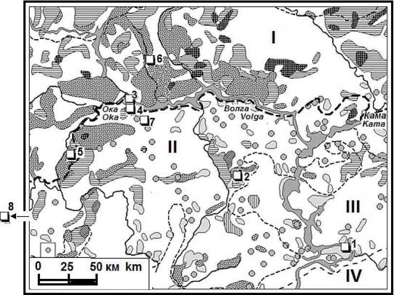 Экспериментальные полигоны: 1 – Жигули; 2 – Присурье; 3 – Щелоковский Хутор; 4 – Зеленый Город; 5 – Выкса; 6 – Керженец (Керженский заповедник); 7 – Кудьма; 8 – Приокско-Террасный заповедник (ПТЗ).
