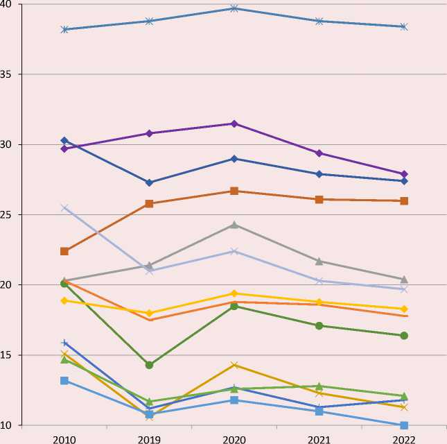Показатель «доля NEET-молодежи» в докладе МОТ представлен только с 2010 года. Его значения за весь наблюдаемый период были высокими и превышали 20%. Максимального значения показатель достиг в 2020 году (23,8%), что обусловлено ограничениями, связанными с COVID-19.