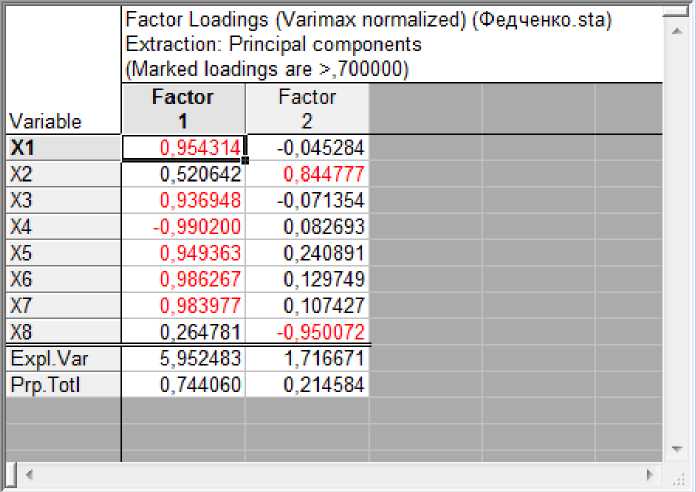 Корреляционная матрица, приведенная на рисунке 9, отражает не только сильную корреляцию переменных X1, X3, X4, X5, X6, X7 с результирующей переменной, но и сильную корреляцию их друг с другом, поэтому применение регрессионного анализа затруднено присутствием мультиколлинеарности объясняющих переменных. В связи с этим в рамках исследования был проведен факторный анализ объясняющих переменных, направленный на снижение размерности пространства объясняющих переменных и формирование небольшого количества общих факторов, а затем построено регрессионное уравнение, где в качестве объясняющих переменных выступают общие факторы.