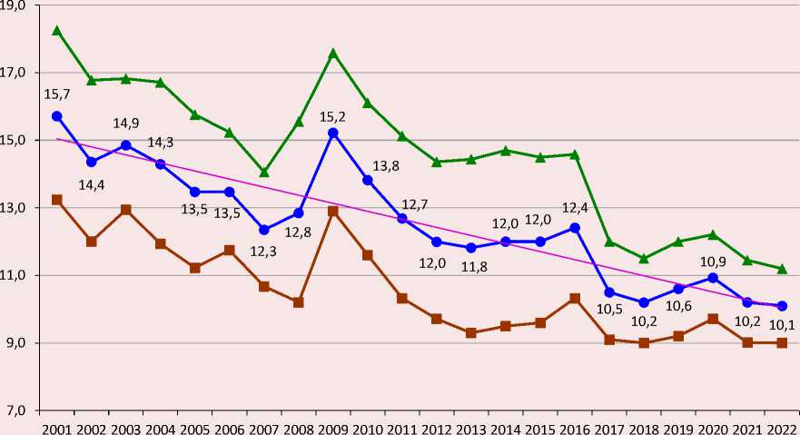 Показатель «уровень безработицы» в 2000– 2022 гг. постоянно колебался в диапазоне от 5,3% в 2022 году до 6,6% в 2020 году в целом на рынке труда, а в молодежном сегменте – от 12,1% в 2000 году до 15,7% в 2020 году. В целом представленные данные подтверждают тезис о сложном положении молодежи на рынке труда и ее уязвимости. В 2022 году показатель «уровень безработицы» снизился по сравнению с доковидными значениями по обеим исследуемым группам.