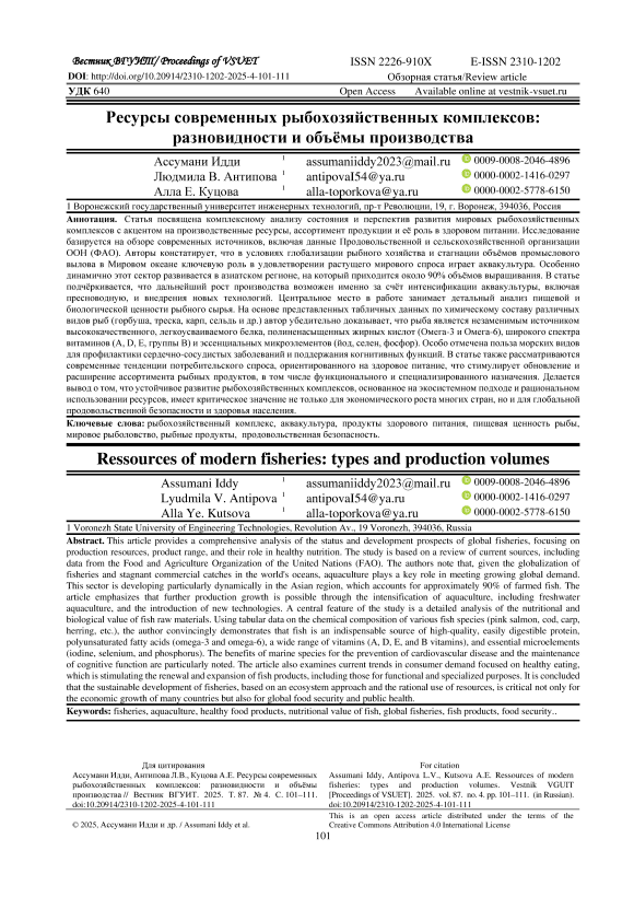 Статья посвящена комплексному анализу состояния и перспектив развития мировых рыбохозяйственных комплексов с акцентом на производственные ресурсы, ассортимент продукции и её роль в здоровом питании. Исследование базируется на обзоре современных источников, включая данные Продовольственной и сельскохозяйственной организации ООН (ФАО). Авторы констатирует, что в условиях глобализации рыбного хозяйства и стагнации объёмов промыслового вылова в Мировом океане ключевую роль в удовлетворении растущего мирового спроса играет аквакультура. Особенно динамично этот сектор развивается в азиатском регионе, на который приходится около 90% объёмов выращивания. В статье подчёркивается, что дальнейший рост производства возможен именно за счёт интенсификации аквакультуры, включая пресноводную, и внедрения новых технологий. Центральное место в работе занимает детальный анализ пищевой и биологической ценности рыбного сырья. На основе представленных табличных данных по химическому составу различных видов рыб (горбуша, треска, карп, сельдь и др.) автор убедительно доказывает, что рыба является незаменимым источником высококачественного, легкоусваиваемого белка, полиненасыщенных жирных кислот (Омега-3 и Омега-6), широкого спектра витаминов (A, D, E, группы B) и эссенциальных микроэлементов (йод, селен, фосфор). Особо отмечена польза морских видов для профилактики сердечно-сосудистых заболеваний и поддержания когнитивных функций. В статье также рассматриваются современные тенденции потребительского спроса, ориентированного на здоровое питание, что стимулирует обновление и расширение ассортимента рыбных продуктов, в том числе функционального и специализированного назначения. Делается вывод о том, что устойчивое развитие рыбохозяйственных комплексов, основанное на экосистемном подходе и рациональном использовании ресурсов, имеет критическое значение не только для экономического роста многих стран, но и для глобальной продовольственной безопасности и здоровья населения.