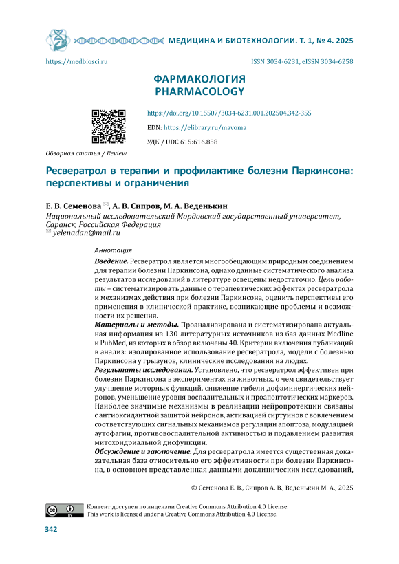 Цель исследования – систематизировать доклинические и клинические данные о терапевтической эффективности и безопасности, механизмах действия ресвератрола при болезни Паркинсона и оценить перспективы и основные препятствия для его клинического применения при указанной патологии.