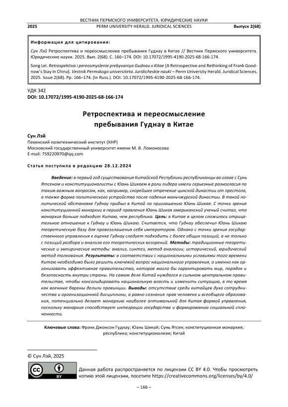 Введение: в первый год существования Китайской Республики, республиканцы, во главе Сунь Ятсеном, и конституционалисты с Юань Шикаем в роли лидера имели серьезные разногласия по таким важным вопросам, как, например, скорейшее отречение цинской династии от престола, а также форма политического устройства после падения маньчжурской династии. В такой политической обстановке Гуднау прибыл в Китай по приглашению Юань Шикая. С точки зрения конституционной монархии, в период Юань Шикая американский ученый считал, что монархия больше подходит Китаю, чем республика. Цель: в Китае в целом сложилось отрицательное отношение к Гуднау и Юань Шикаю. Считается, что Гуднау обеспечил Юань Шикаю теоретическую базу для провозглашения себя императором. Однако с точки зрения государственного управления к оценке Гуднау следует подходить с более общих позиций, а не только с позиций разбора и анализа его теоретических воззрений. Методы: традиционные теоретические и эмпирические методы: анализ, синтез, аналогии; исторический, юридический метод толкования. Результаты: в соответствии с национальными условиями того времени Китаю необходимо было решить ключевой вопрос национального управления, а именно, как организовать эффективное правительство, которое могло бы гарантировать мир, порядок и безопасность внутри страны. На самом деле Китай нуждался в сильном центральном правительстве, чтобы консолидировать национальную власть и заменить разобщенную ситуацию, когда в то время военные бароны делили провинции. Выводы: отсутствие среди китайцев духа сотрудничества и организационной дисциплины, а равно сознания прав человека и всеобщего образования, потенциально делает для Китая монархию наиболее оптимальной формой управления, поскольку монархия способствует интеграции государства и формированию социальной сплоченности.
